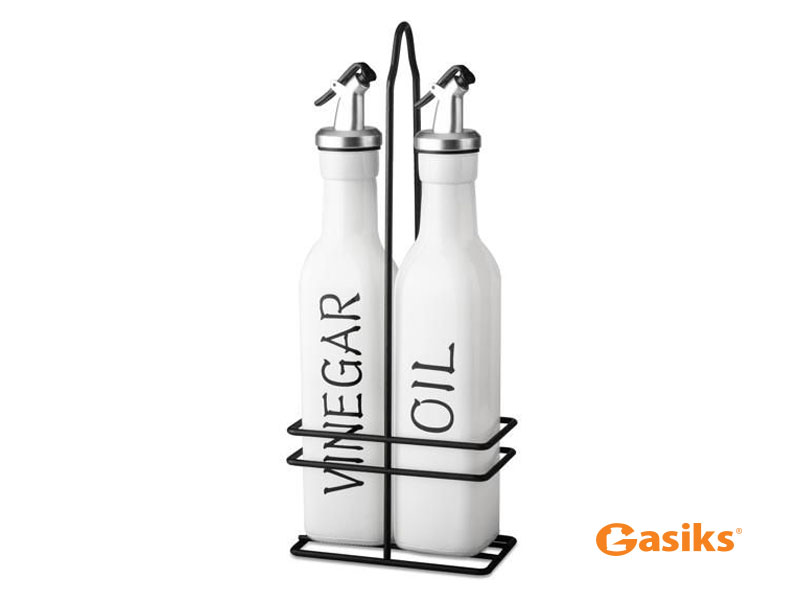 Posude za ulje i sirće poseduju metalni stalak sa drškom i graničnicima, koji sprečavaju ispadanje ili prevrtanje boca. Ovaj set posuda idelan je i za dekoraciju stola, a zauzima veom malo mesta. Boce za posluživanje ulja i sirća biće Vam uvek na dohvat ruke.